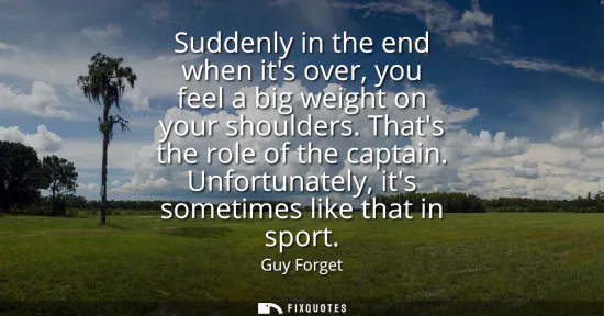 There is a particular kind of loneliness that only shows up after the noise stops. Guy Forget’s line lands because it refuses the usual sports-hero script, where leadership is a swaggering accessory and pressure is something you “use as fuel.” He describes the captaincy as delayed impact: in the moment, adrenaline and routine keep you upright; “suddenly in the end” is when responsibility cashes out. The weight isn’t just performance anxiety. It’s the quiet inventory a captain takes after a loss or a collapse: Did I set the tone? Protect the group? Say the right thing when it mattered? Did my calm read as confidence or indifference?