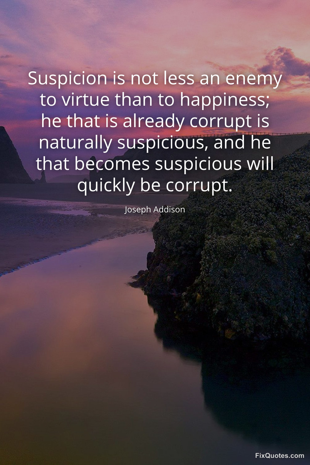 Addison, Joseph. "Suspicion is not less an enemy to virtue than to happiness; he that is already corrupt is naturally suspicious, and he that becomes suspicious will quickly be corrupt." FixQuotes. January 15, 2026. https://fixquotes.com/quotes/suspicion-is-not-less-an-enemy-to-virtue-than-to-157241/.