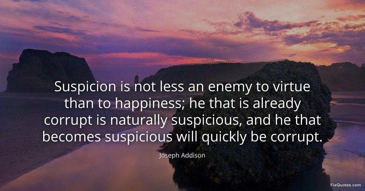 Addison, Joseph. (2026, January 15). Suspicion is not less an enemy to virtue than to happiness; he that is already corrupt is naturally suspicious, and he that becomes suspicious will quickly be corrupt. FixQuotes. https://fixquotes.com/quotes/suspicion-is-not-less-an-enemy-to-virtue-than-to-157241/