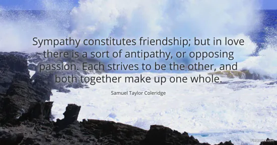 Coleridge, Samuel Taylor. (2026, January 16). Sympathy constitutes friendship; but in love there is a sort of antipathy, or opposing passion. Each strives to be the other, and both together make up one whole. FixQuotes. https://fixquotes.com/quotes/sympathy-constitutes-friendship-but-in-love-there-127354/