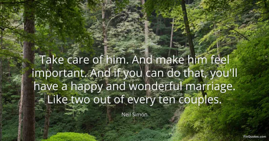 Simon, Neil. "Take care of him. And make him feel important. And if you can do that, you'll have a happy and wonderful marriage. Like two out of every ten couples." FixQuotes. January 18, 2026. https://fixquotes.com/quotes/take-care-of-him-and-make-him-feel-important-and-12550/.