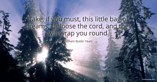 Yeats, William Butler. "Take, if you must, this little bag of dreams, Unloose the cord, and they will wrap you round." FixQuotes. January 18, 2026. https://fixquotes.com/quotes/take-if-you-must-this-little-bag-of-dreams-11056/.
