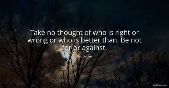 "Be not for or against" points to a more profound sense of impartiality and openness. Rather than identifying strongly with one position and against another, Lee advocates for embracing a state beyond duality. Taking sides often creates divisions and prevents people from seeing the complexities of a situation or individual. This polarity can blind individuals to new perspectives and fosters attachment to limited viewpoints. By withholding judgment and the compulsion to take sides, people become more receptive, flexible, and wise.