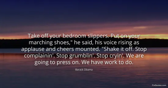 Obama, Barack. "Take off your bedroom slippers. Put on your marching shoes," he said, his voice rising as applause and cheers mounted. "Shake it off. Stop complainin'. Stop grumblin'. Stop cryin'. We are going to press on. We have work to do." FixQuotes. January 17, 2026. https://fixquotes.com/quotes/take-off-your-bedroom-slippers-put-on-your-35385/.