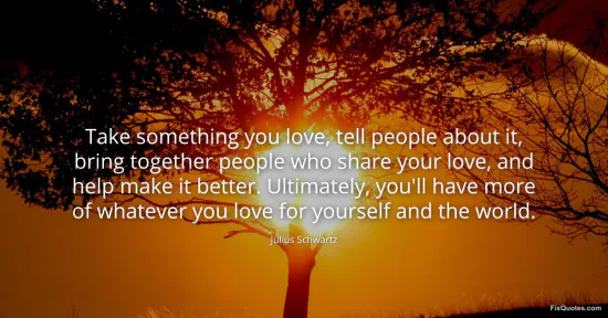Schwartz, Julius. "Take something you love, tell people about it, bring together people who share your love, and help make it better. Ultimately, you'll have more of whatever you love for yourself and the world." FixQuotes. January 15, 2026. https://fixquotes.com/quotes/take-something-you-love-tell-people-about-it-122528/.