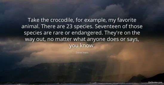 Irwin, Steve. "Take the crocodile, for example, my favorite animal. There are 23 species. Seventeen of those species are rare or endangered. They're on the way out, no matter what anyone does or says, you know." FixQuotes. January 16, 2026. https://fixquotes.com/quotes/take-the-crocodile-for-example-my-favorite-animal-84186/.