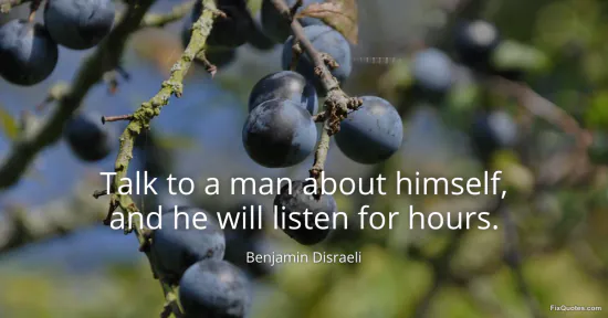 Disraeli, Benjamin. (2026, February 16). Talk to a man about himself, and he will listen for hours. FixQuotes. https://fixquotes.com/quotes/talk-to-a-man-about-himself-and-he-will-listen-35389/