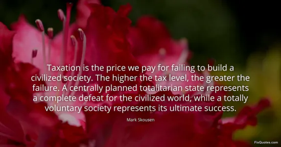 Skousen, Mark. (2026, January 16). Taxation is the price we pay for failing to build a civilized society. The higher the tax level, the greater the failure. A centrally planned totalitarian state represents a complete defeat for the civilized world, while a totally voluntary society represents its ultimate success. FixQuotes. https://fixquotes.com/quotes/taxation-is-the-price-we-pay-for-failing-to-build-112470/