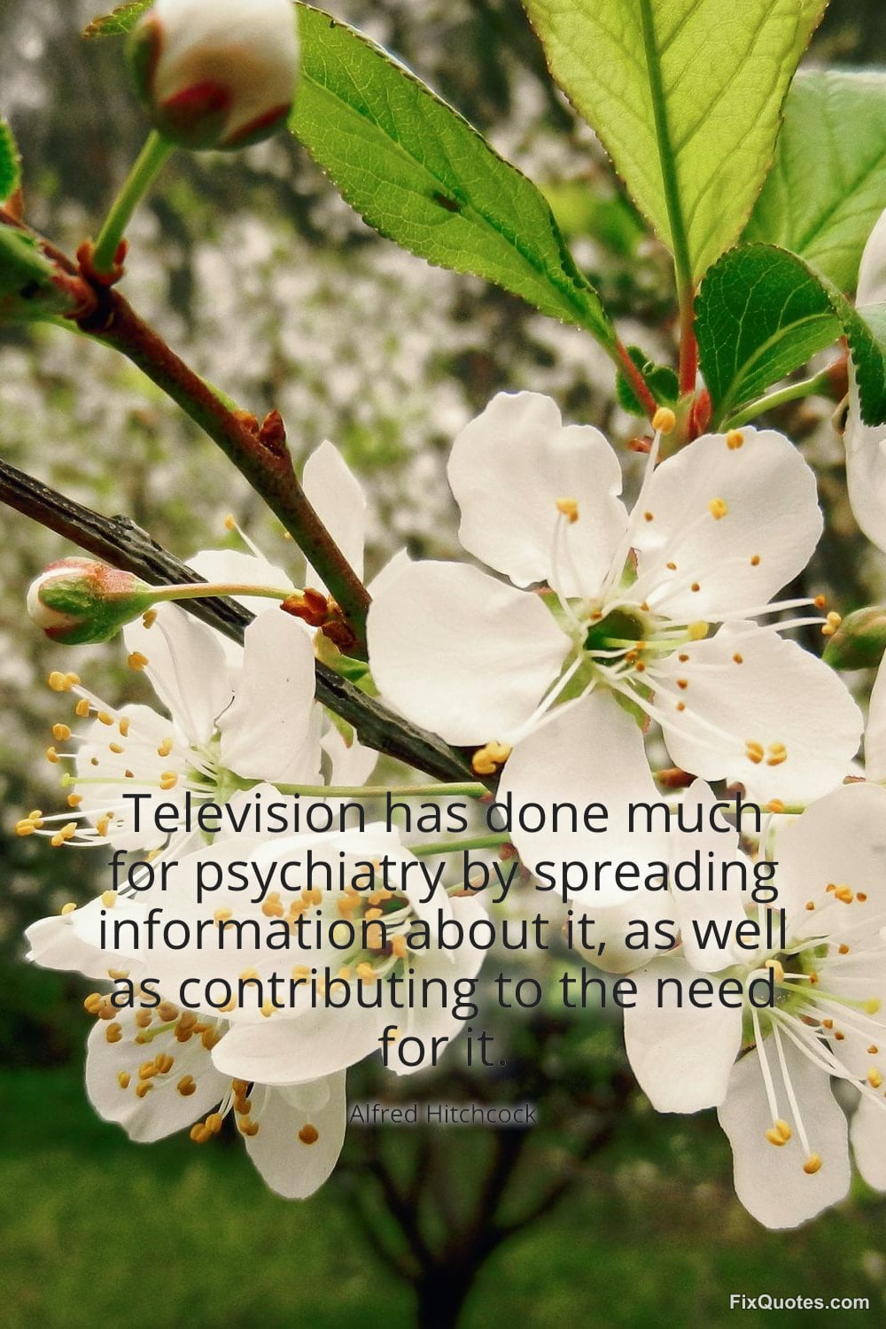 Hitchcock, Alfred. (2026, January 18). Television has done much for psychiatry by spreading information about it, as well as contributing to the need for it. FixQuotes. https://fixquotes.com/quotes/television-has-done-much-for-psychiatry-by-3537/