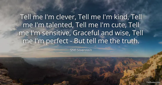 Silverstein, Shel. (2026, January 16). Tell me I'm clever, Tell me I'm kind, Tell me I'm talented, Tell me I'm cute, Tell me I'm sensitive, Graceful and wise, Tell me I'm perfect - But tell me the truth. FixQuotes. https://fixquotes.com/quotes/tell-me-im-clever-tell-me-im-kind-tell-me-im-121455/