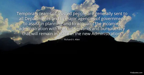 Allen, Richard V. "Temporary teams of trusted people are generally sent to all Departments and to major agencies of government to assist in planning and to acquaint the incoming administration with the civil servants and bureaucracy that will remain in place in the new Administration." FixQuotes. January 17, 2026. https://fixquotes.com/quotes/temporary-teams-of-trusted-people-are-generally-81351/.