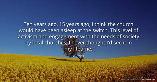 Hybels, Bill. "Ten years ago, 15 years ago, I think the church would have been asleep at the switch. This level of activism and engagement with the needs of society by local churches, I never thought I'd see it in my lifetime." FixQuotes. February 19, 2026. https://fixquotes.com/quotes/ten-years-ago-15-years-ago-i-think-the-church-47898/.