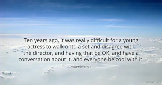 Gyllenhaal, Maggie. "Ten years ago, it was really difficult for a young actress to walk onto a set and disagree with the director, and having that be OK, and have a conversation about it, and everyone be cool with it." FixQuotes. February 17, 2026. https://fixquotes.com/quotes/ten-years-ago-it-was-really-difficult-for-a-young-158227/.
