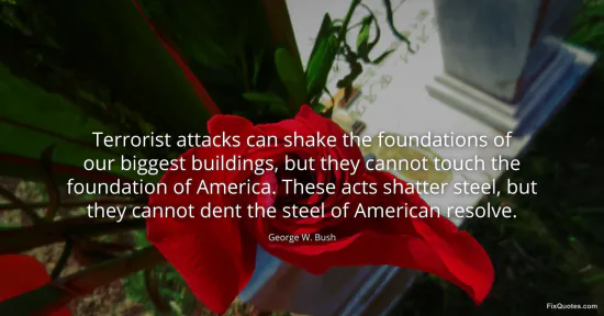 Bush, George W. "Terrorist attacks can shake the foundations of our biggest buildings, but they cannot touch the foundation of America. These acts shatter steel, but they cannot dent the steel of American resolve." FixQuotes. January 18, 2026. https://fixquotes.com/quotes/terrorist-attacks-can-shake-the-foundations-of-7292/.