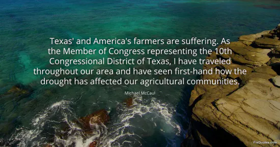 McCaul, Michael. "Texas' and America's farmers are suffering. As the Member of Congress representing the 10th Congressional District of Texas, I have traveled throughout our area and have seen first-hand how the drought has affected our agricultural communities." FixQuotes. January 17, 2026. https://fixquotes.com/quotes/texas-and-americas-farmers-are-suffering-as-the-77620/.