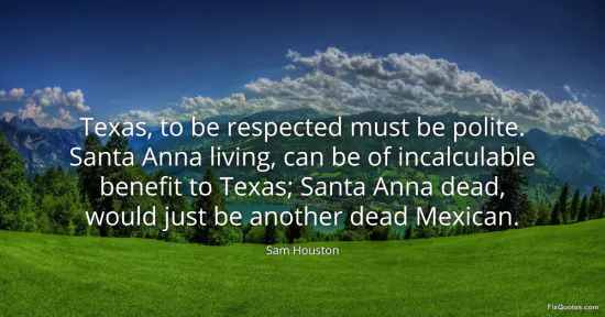 Houston, Sam. "Texas, to be respected must be polite. Santa Anna living, can be of incalculable benefit to Texas; Santa Anna dead, would just be another dead Mexican." FixQuotes. January 15, 2026. https://fixquotes.com/quotes/texas-to-be-respected-must-be-polite-santa-anna-169694/.