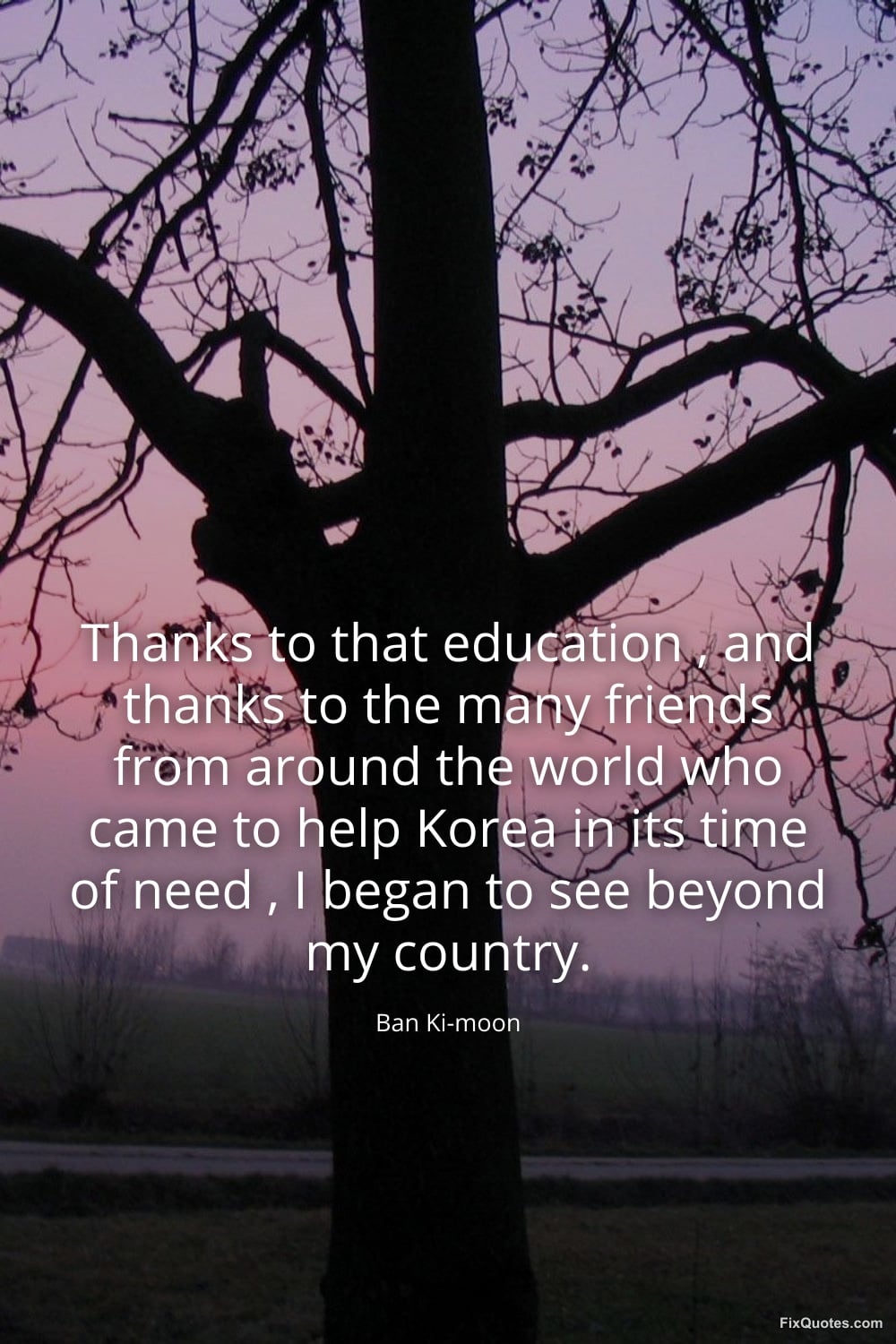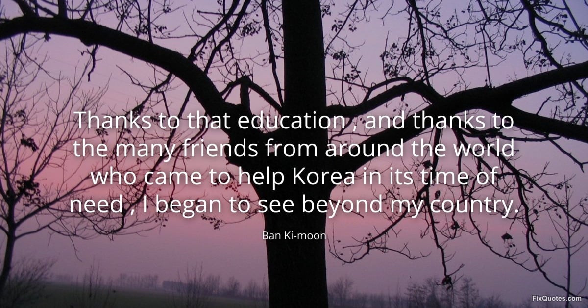Ki-moon, Ban. "Thanks to that education , and thanks to the many friends from around the world who came to help Korea in its time of need , I began to see beyond my country." FixQuotes. March 8, 2026. https://fixquotes.com/quotes/thanks-to-that-education-and-thanks-to-the-many-185756/.