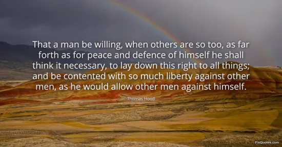 Hood, Thomas. (n.d.). That a man be willing, when others are so too, as far forth as for peace and defence of himself he shall think it necessary, to lay down this right to all things; and be contented with so much liberty against other men, as he would allow other men against himself. FixQuotes. https://fixquotes.com/quotes/that-a-man-be-willing-when-others-are-so-too-as-121908/