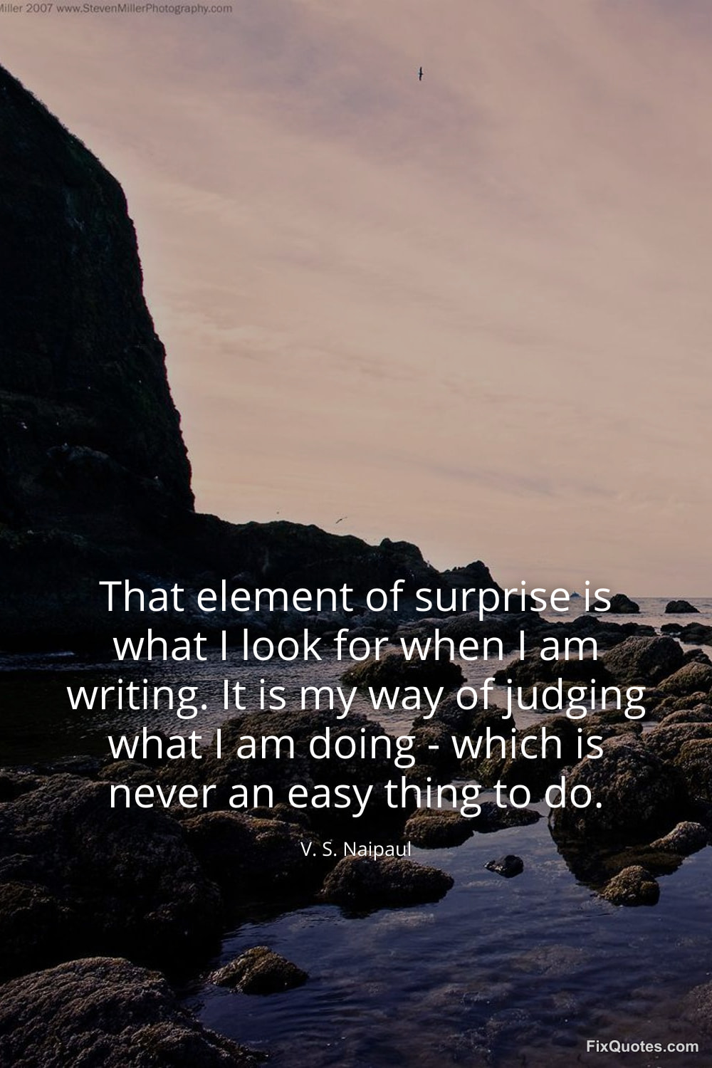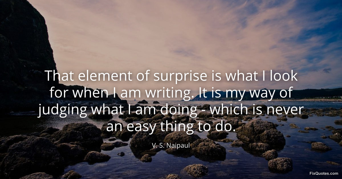 Naipaul, V. S. (2026, January 16). That element of surprise is what I look for when I am writing. It is my way of judging what I am doing - which is never an easy thing to do. FixQuotes. https://fixquotes.com/quotes/that-element-of-surprise-is-what-i-look-for-when-104328/