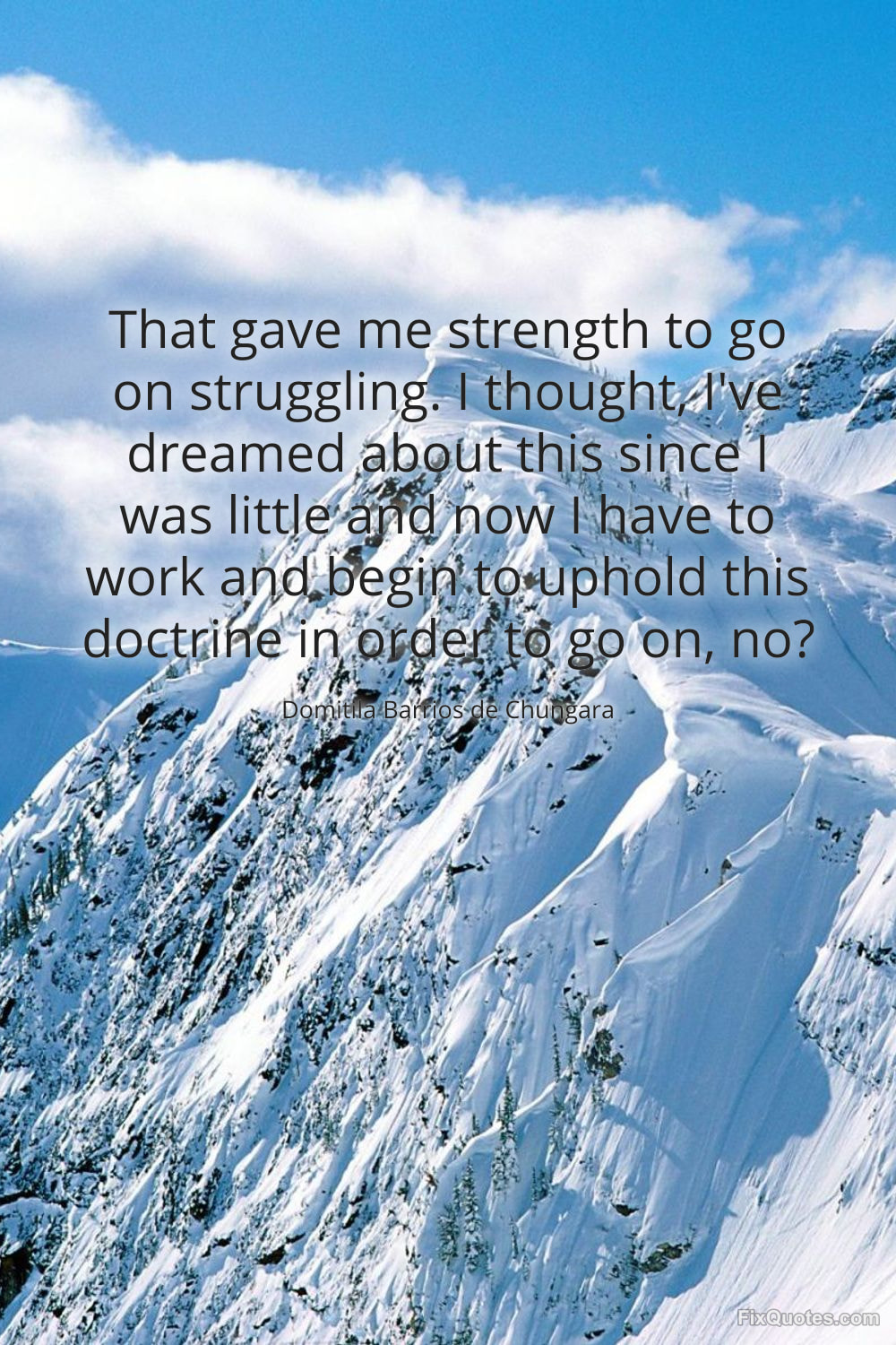 Chungara, Domitila Barrios de. "That gave me strength to go on struggling. I thought, I've dreamed about this since I was little and now I have to work and begin to uphold this doctrine in order to go on, no?" FixQuotes. February 16, 2026. https://fixquotes.com/quotes/that-gave-me-strength-to-go-on-struggling-i-185487/.