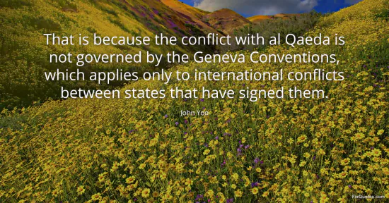 Yoo, John. (2026, January 16). That is because the conflict with al Qaeda is not governed by the Geneva Conventions, which applies only to international conflicts between states that have signed them. FixQuotes. https://fixquotes.com/quotes/that-is-because-the-conflict-with-al-qaeda-is-not-87660/