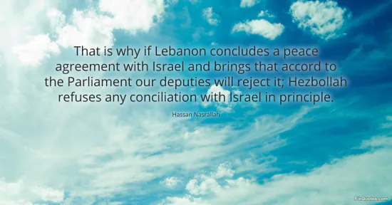 Nasrallah, Hassan. (2026, January 18). That is why if Lebanon concludes a peace agreement with Israel and brings that accord to the Parliament our deputies will reject it; Hezbollah refuses any conciliation with Israel in principle. FixQuotes. https://fixquotes.com/quotes/that-is-why-if-lebanon-concludes-a-peace-18909/