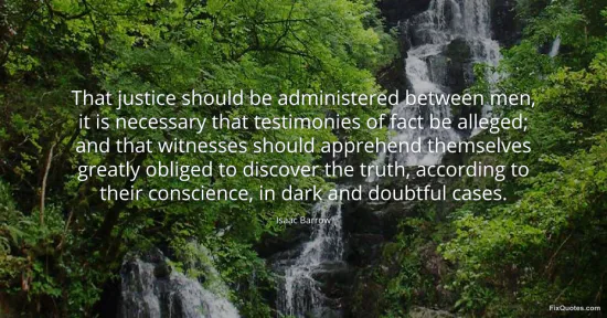 Justice, for Barrow, is less a lofty ideal than a fragile machine: it only runs if ordinary people supply it with reliable fuel. The sentence builds like a proof. First premise: courts can’t dispense justice in the abstract; they need “testimonies of fact.” Second: facts don’t walk into the room on their own. Third: in the “dark and doubtful cases” that most strain the system, truth depends on whether witnesses feel “greatly obliged” to speak plainly.