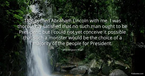 Wise, John Sergeant. "That settled Abraham Lincoln with me. I was thoroughly satisfied that no such man ought to be President; but I could not yet conceive it possible that such a monster would be the choice of a majority of the people for President." FixQuotes. January 15, 2026. https://fixquotes.com/quotes/that-settled-abraham-lincoln-with-me-i-was-158716/.