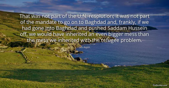 Aspin, Les. "That was not part of the U.N. resolution; it was not part of the mandate to go on to Baghdad and, frankly, if we had gone into Baghdad and pushed Saddam Hussein off, we would have inherited an even bigger mess than the mess we inherited with the refugee problem." FixQuotes. January 15, 2026. https://fixquotes.com/quotes/that-was-not-part-of-the-un-resolution-it-was-not-152700/.