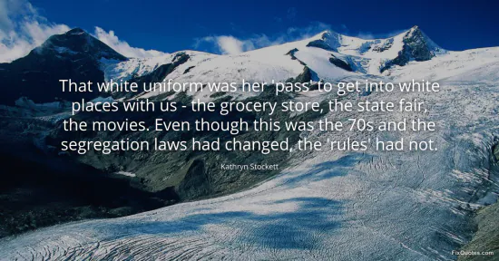 Stockett, Kathryn. "That white uniform was her 'pass' to get into white places with us - the grocery store, the state fair, the movies. Even though this was the 70s and the segregation laws had changed, the 'rules' had not." FixQuotes. January 16, 2026. https://fixquotes.com/quotes/that-white-uniform-was-her-pass-to-get-into-white-91982/.