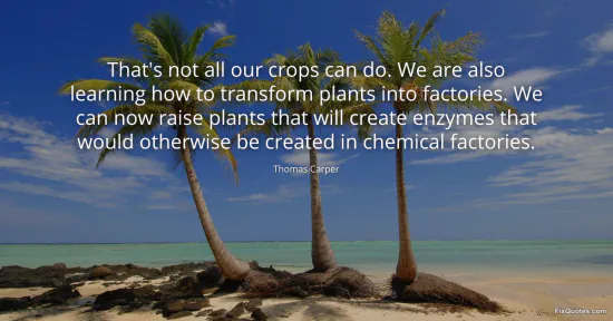 Carper, Thomas. (2026, January 16). That's not all our crops can do. We are also learning how to transform plants into factories. We can now raise plants that will create enzymes that would otherwise be created in chemical factories. FixQuotes. https://fixquotes.com/quotes/thats-not-all-our-crops-can-do-we-are-also-90420/