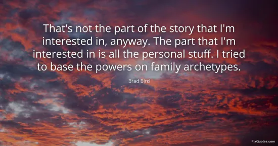 Bird, Brad. "That's not the part of the story that I'm interested in, anyway. The part that I'm interested in is all the personal stuff. I tried to base the powers on family archetypes." FixQuotes. January 17, 2026. https://fixquotes.com/quotes/thats-not-the-part-of-the-story-that-im-41768/.