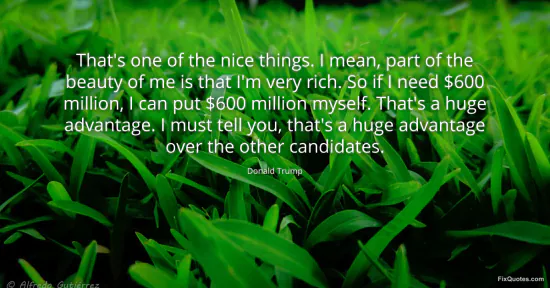 Trump, Donald. (2026, January 15). That's one of the nice things. I mean, part of the beauty of me is that I'm very rich. So if I need $600 million, I can put $600 million myself. That's a huge advantage. I must tell you, that's a huge advantage over the other candidates. FixQuotes. https://fixquotes.com/quotes/thats-one-of-the-nice-things-i-mean-part-of-the-6414/
