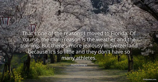 Hingis, Martina. "That's one of the reasons I moved to Florida. Of course, the main reason is the weather and the training. But there's more jealousy in Switzerland because it's so little and they don't have so many athletes." FixQuotes. January 16, 2026. https://fixquotes.com/quotes/thats-one-of-the-reasons-i-moved-to-florida-of-127694/.