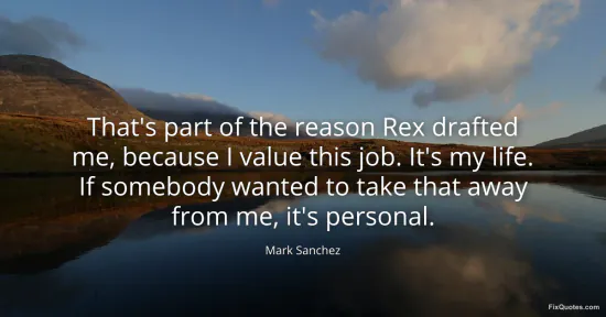 Sanchez, Mark. (2026, January 15). That's part of the reason Rex drafted me, because I value this job. It's my life. If somebody wanted to take that away from me, it's personal. FixQuotes. https://fixquotes.com/quotes/thats-part-of-the-reason-rex-drafted-me-because-i-153804/