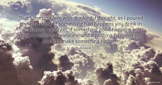 Bukowski, Charles. (2026, February 10). That's the problem with drinking, I thought, as I poured myself a drink. If something bad happens you drink in an attempt to forget; if something good happens you drink in order to celebrate; and if nothing happens you drink to make something happen. FixQuotes. https://fixquotes.com/quotes/thats-the-problem-with-drinking-i-thought-as-i-185131/