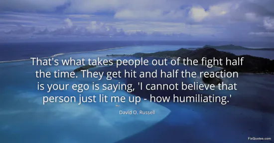 Russell, David O. "That's what takes people out of the fight half the time. They get hit and half the reaction is your ego is saying, 'I cannot believe that person just lit me up - how humiliating.'." FixQuotes. January 17, 2026. https://fixquotes.com/quotes/thats-what-takes-people-out-of-the-fight-half-the-65019/.