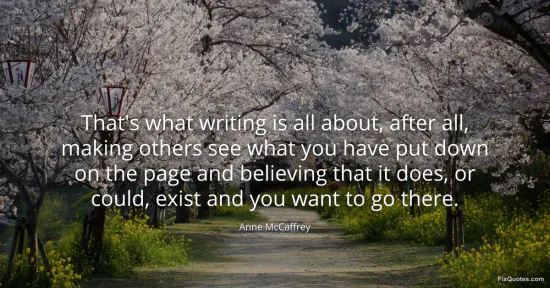 McCaffrey, Anne. "That's what writing is all about, after all, making others see what you have put down on the page and believing that it does, or could, exist and you want to go there." FixQuotes. January 16, 2026. https://fixquotes.com/quotes/thats-what-writing-is-all-about-after-all-making-137850/.