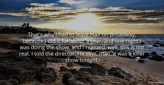McGuire, Barry. (2026, January 15). That's why I had to leave Hair on Broadway, because I did it for about a year, and one night I was doing the show, and I realized, well, this is not real. I told the director. He says, man, it was a killer show tonight. FixQuotes. https://fixquotes.com/quotes/thats-why-i-had-to-leave-hair-on-broadway-because-39984/