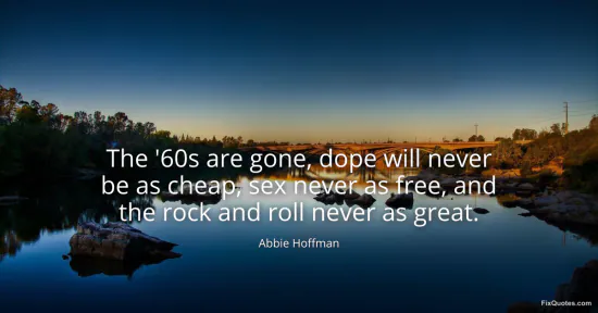 Hoffman, Abbie. "The '60s are gone, dope will never be as cheap, sex never as free, and the rock and roll never as great." FixQuotes. January 17, 2026. https://fixquotes.com/quotes/the-60s-are-gone-dope-will-never-be-as-cheap-sex-38498/.