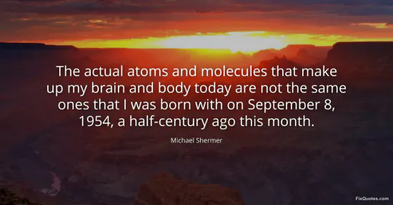 Shermer, Michael. "The actual atoms and molecules that make up my brain and body today are not the same ones that I was born with on September 8, 1954, a half-century ago this month." FixQuotes. January 16, 2026. https://fixquotes.com/quotes/the-actual-atoms-and-molecules-that-make-up-my-99990/.