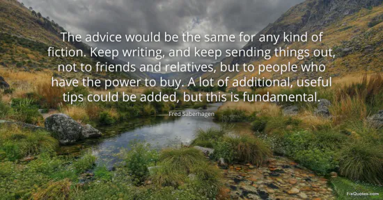Saberhagen, Fred. "The advice would be the same for any kind of fiction. Keep writing, and keep sending things out, not to friends and relatives, but to people who have the power to buy. A lot of additional, useful tips could be added, but this is fundamental." FixQuotes. January 17, 2026. https://fixquotes.com/quotes/the-advice-would-be-the-same-for-any-kind-of-70561/.