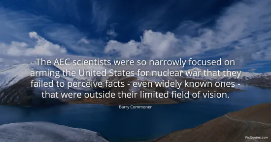 Commoner, Barry. "The AEC scientists were so narrowly focused on arming the United States for nuclear war that they failed to perceive facts - even widely known ones - that were outside their limited field of vision." FixQuotes. January 17, 2026. https://fixquotes.com/quotes/the-aec-scientists-were-so-narrowly-focused-on-39192/.