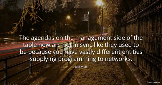 Wolf, Dick. (2026, January 17). The agendas on the management side of the table now are not in sync like they used to be because you have vastly different entities supplying programming to networks. FixQuotes. https://fixquotes.com/quotes/the-agendas-on-the-management-side-of-the-table-57081/
