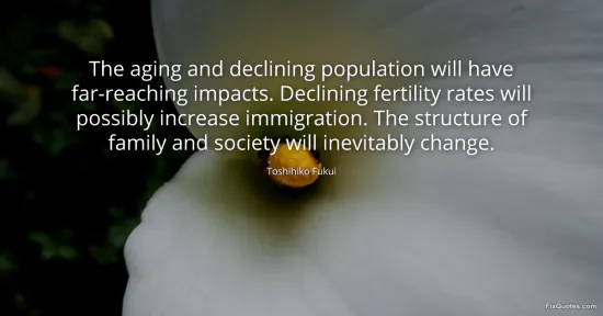 Fukui, Toshihiko. (2026, January 15). The aging and declining population will have far-reaching impacts. Declining fertility rates will possibly increase immigration. The structure of family and society will inevitably change. FixQuotes. https://fixquotes.com/quotes/the-aging-and-declining-population-will-have-105510/