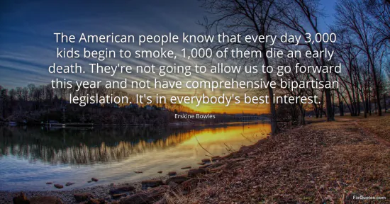 Bowles, Erskine. "The American people know that every day 3,000 kids begin to smoke, 1,000 of them die an early death. They're not going to allow us to go forward this year and not have comprehensive bipartisan legislation. It's in everybody's best interest." FixQuotes. January 17, 2026. https://fixquotes.com/quotes/the-american-people-know-that-every-day-3000-kids-58288/.