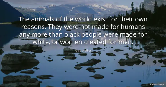 "The animals of the world exist for their own reasons. They were not made for humans any more than black people were made for white, or women created for men." FixQuotes, 16 Jan. 2026, https://fixquotes.com/quotes/the-animals-of-the-world-exist-for-their-own-110807/. Accessed 12 Feb. 2026.