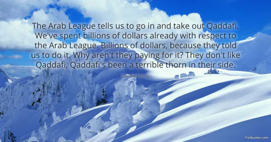 Trump, Donald. (2026, January 18). The Arab League tells us to go in and take out Qaddafi. We've spent billions of dollars already with respect to the Arab League. Billions of dollars, because they told us to do it. Why aren't they paying for it? They don't like Qaddafi, Qaddafi's been a terrible thorn in their side. FixQuotes. https://fixquotes.com/quotes/the-arab-league-tells-us-to-go-in-and-take-out-6416/
