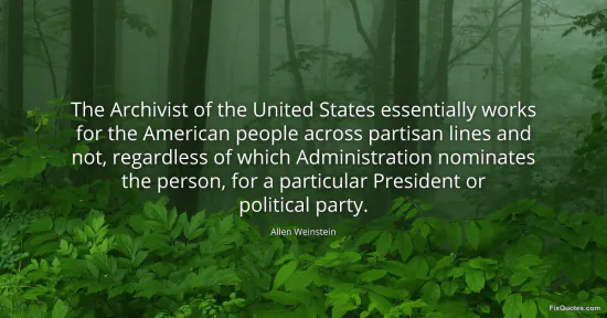 Weinstein, Allen. "The Archivist of the United States essentially works for the American people across partisan lines and not, regardless of which Administration nominates the person, for a particular President or political party." FixQuotes. January 15, 2026. https://fixquotes.com/quotes/the-archivist-of-the-united-states-essentially-140214/.