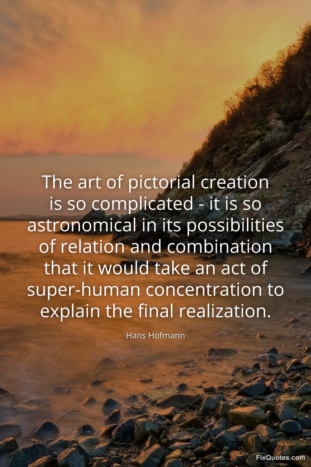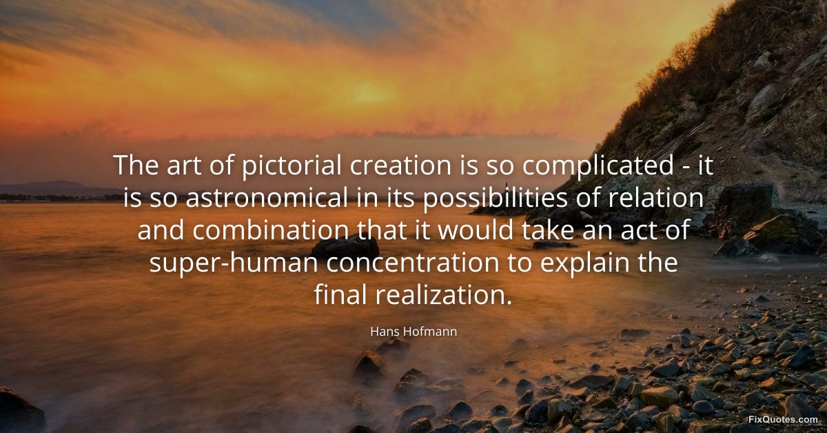Hofmann, Hans. (2026, January 15). The art of pictorial creation is so complicated - it is so astronomical in its possibilities of relation and combination that it would take an act of super-human concentration to explain the final realization. FixQuotes. https://fixquotes.com/quotes/the-art-of-pictorial-creation-is-so-complicated-144084/